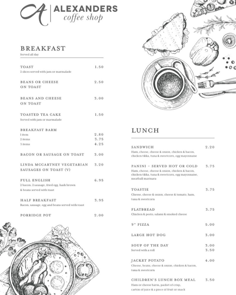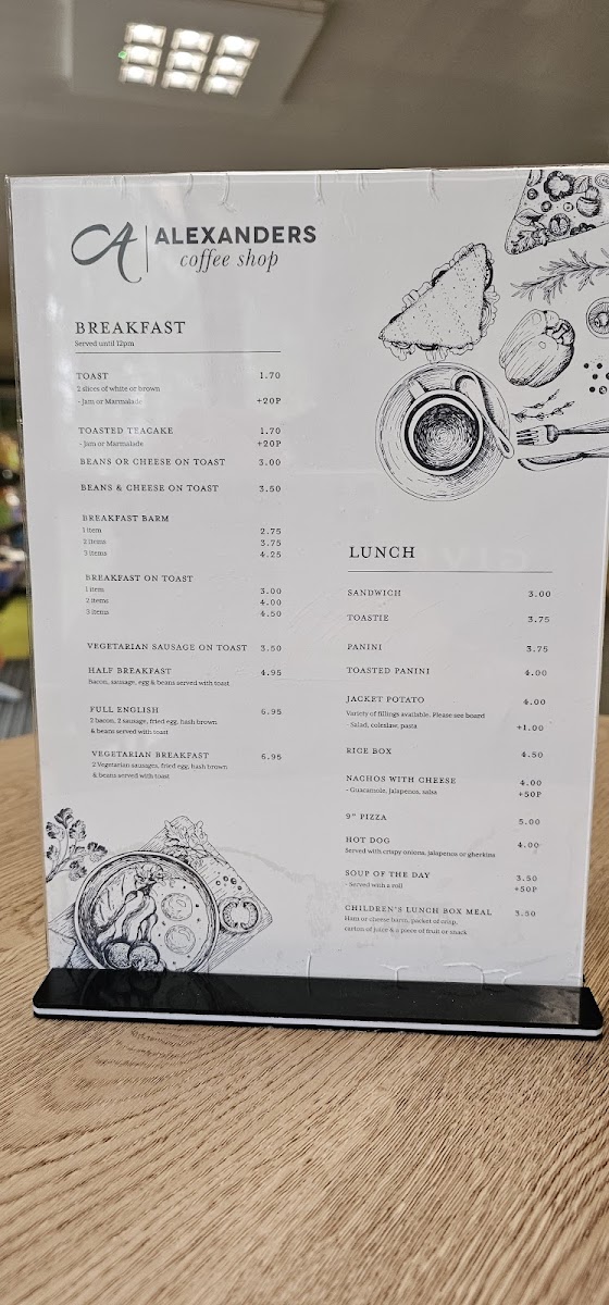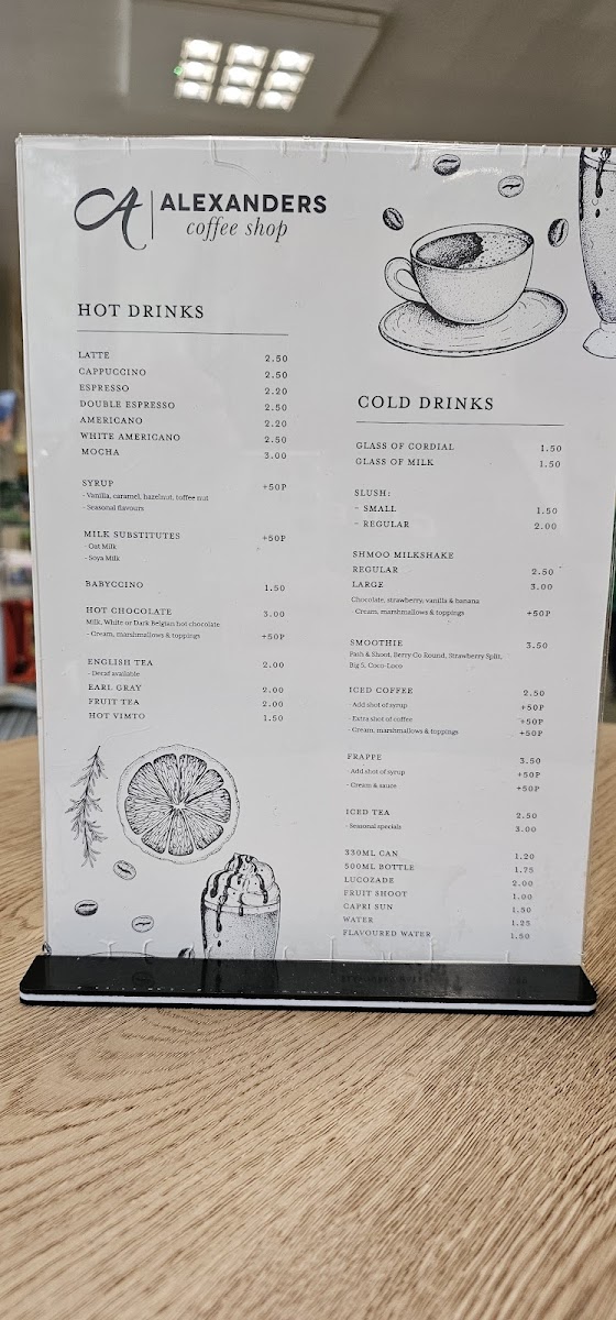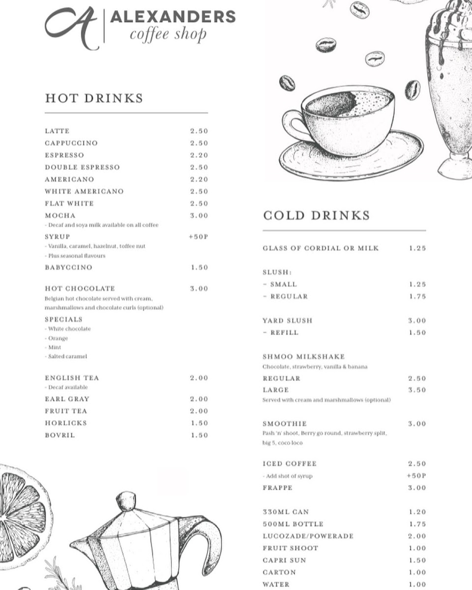 The menu at Alexanders Coffee Shop offers a delightful range of drinks to suit every taste. For those who prefer a warm pick-me-up, there's a variety of hot beverages, including a smooth Latte, a rich Espresso, and a robust Double Espresso. The Americano and White Americano are perfect for anyone seeking a classic coffee experience. If you're in the mood for something cold, the Glass of Cordial or Glass of Milk are refreshing options, while the indulgent Shmoo Milkshake and healthy Smoothie provide a deliciously creamy alternative. For a more energizing treat, the Iced Coffee is a must-try. Additionally, the comforting Horlicks offers a nostalgic touch to round out the drink selection. Whether you're after something hot, cold, or somewhere in between, Alexanders Coffee Shop's menu has a drink for everyone.